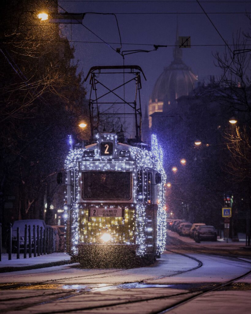 During the Christmas season, Budapest’s tram network transforms into something entirely different. Selected trams are covered in thousands of lights, creating moving installations that travel across the city after dark.